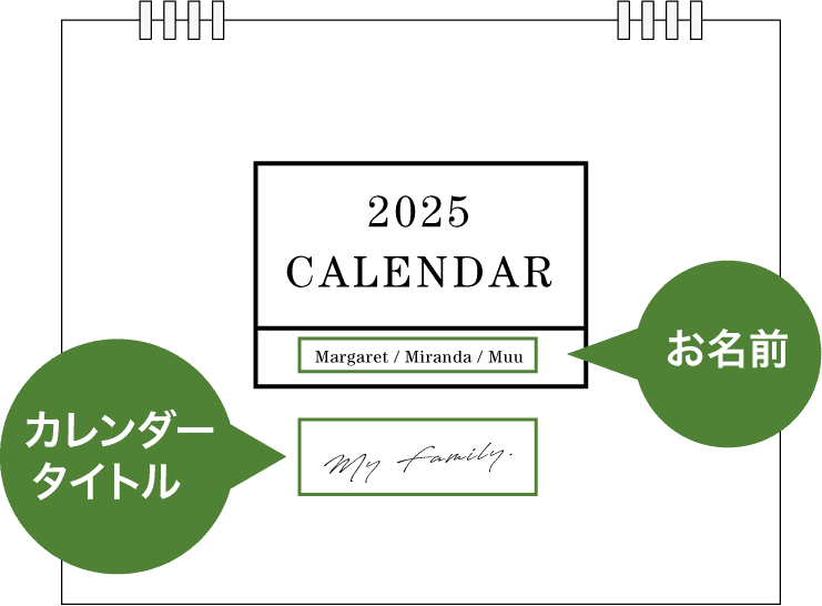 フォトカレンダーのタイトルと、お渡しする相手やモデル(被写体)の名前を入力してください。